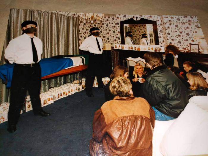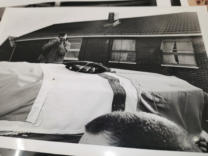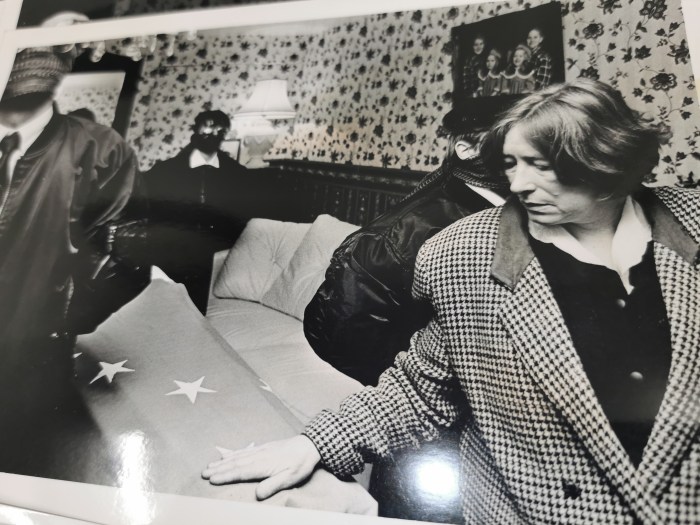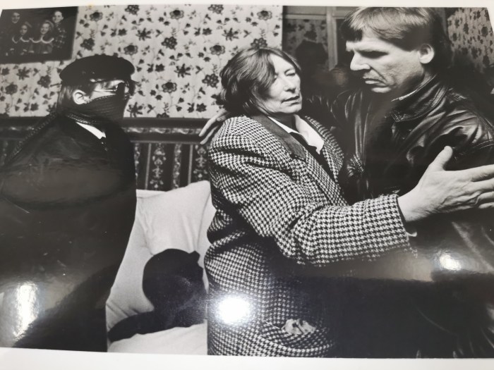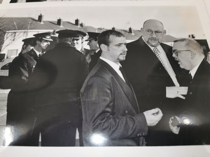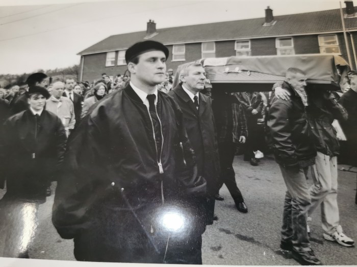 Gino’s brother Brendan (centre) outside Gino’s home during the wake and negotiations with RUC