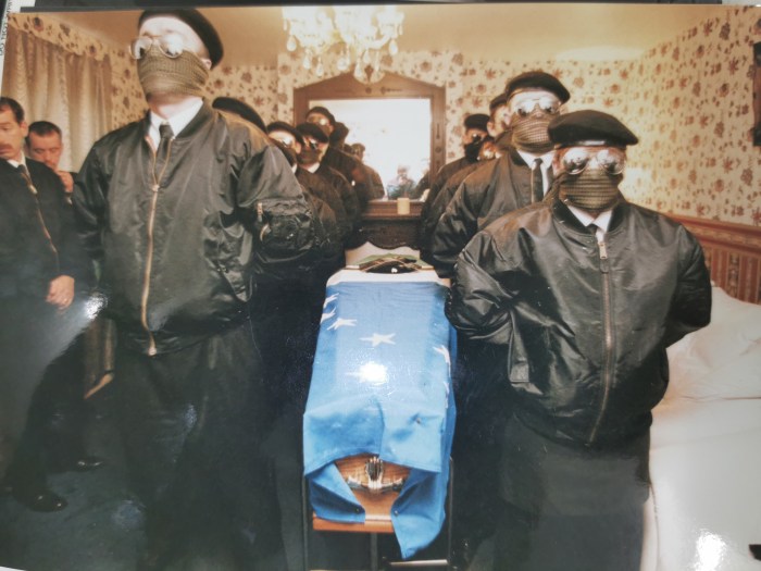 A guard of honour stands at Gino’s coffin in his Glencolin home, joined by family, friends and comrades
