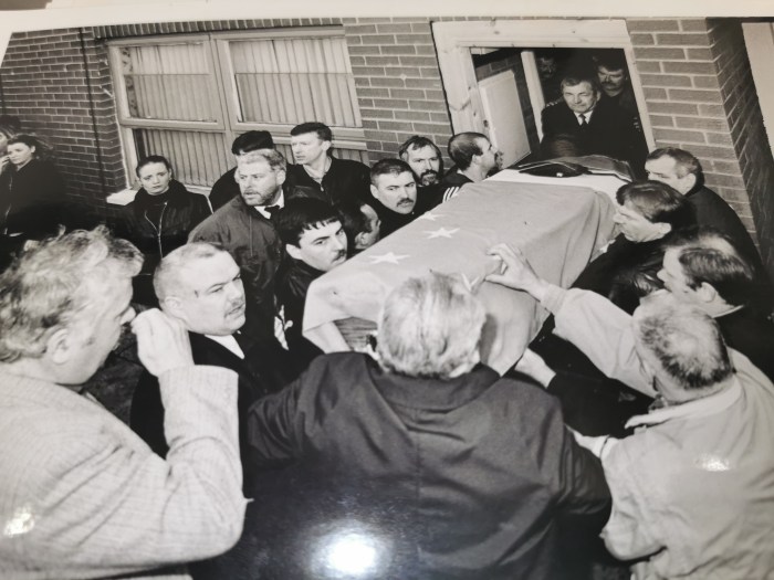 Gino’s coffin leaves Glencolin on the second attempt, flanked by guard of honour